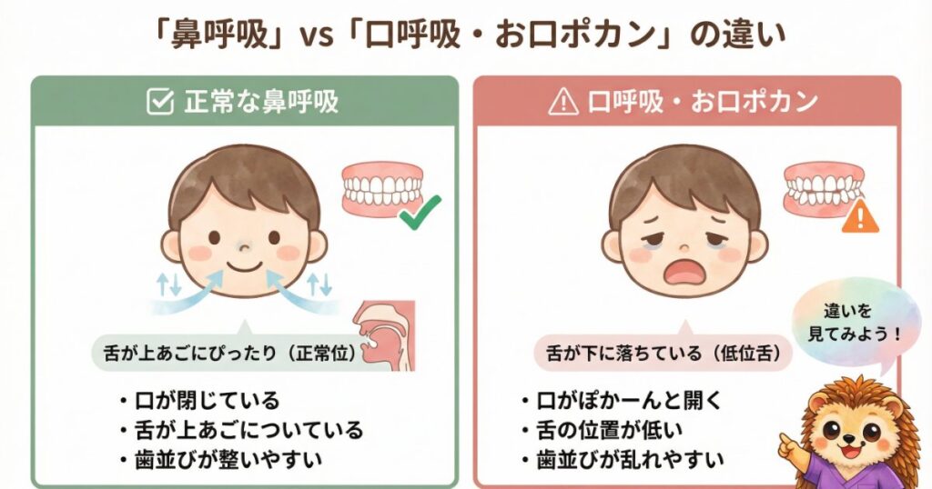 📖 参考:口呼吸と不正咬合に関する系統的レビュー(PMC, 2024年)では、口呼吸児は鼻呼吸児に比べて歯列不正の有病率が有意に高いことが報告されています。※2