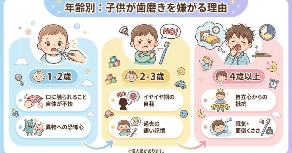 仕上げ磨きを嫌がる理由は、年齢によって異なります。まずは子どもの気持ちを理解することが、声かけの第一歩です。